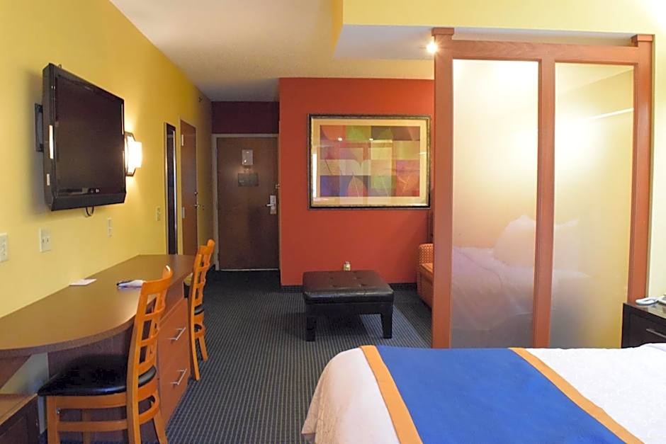 Suite includes microwave, refrigerator and seating area with sofa bed.